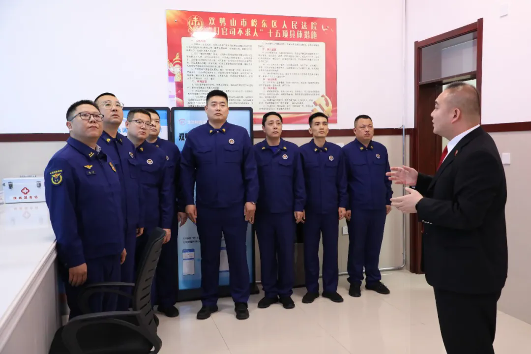 在法院工作人员的引导下,消防指战员们首先参观了诉讼服务中心。从安检流程到立案窗口服务,再到智慧法院自助终端的操作演示,工作人员详细介绍了群众参与诉讼的全过程,让大家亲身感受“一站式”诉讼服务的便捷与高效。随后,消防指战员们依次参观了审判法庭、党建活动室等场所。在互动体验环节,指战员们走上审判席、公诉席,在工作人员讲解下了解庭审程序和法庭规则。这种沉浸式的体验,让大家对司法工作的严谨性和公正性有了更直观的认识。