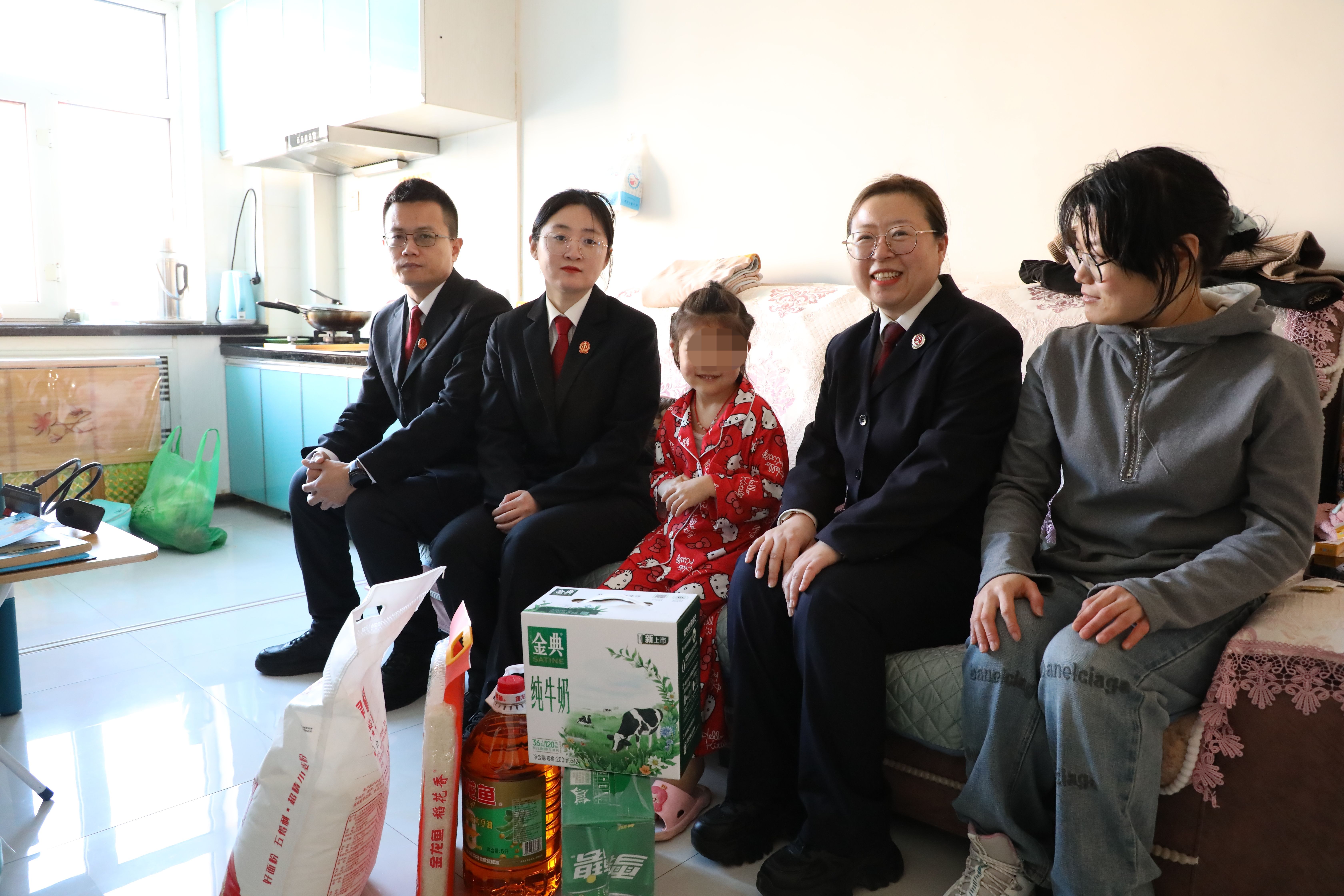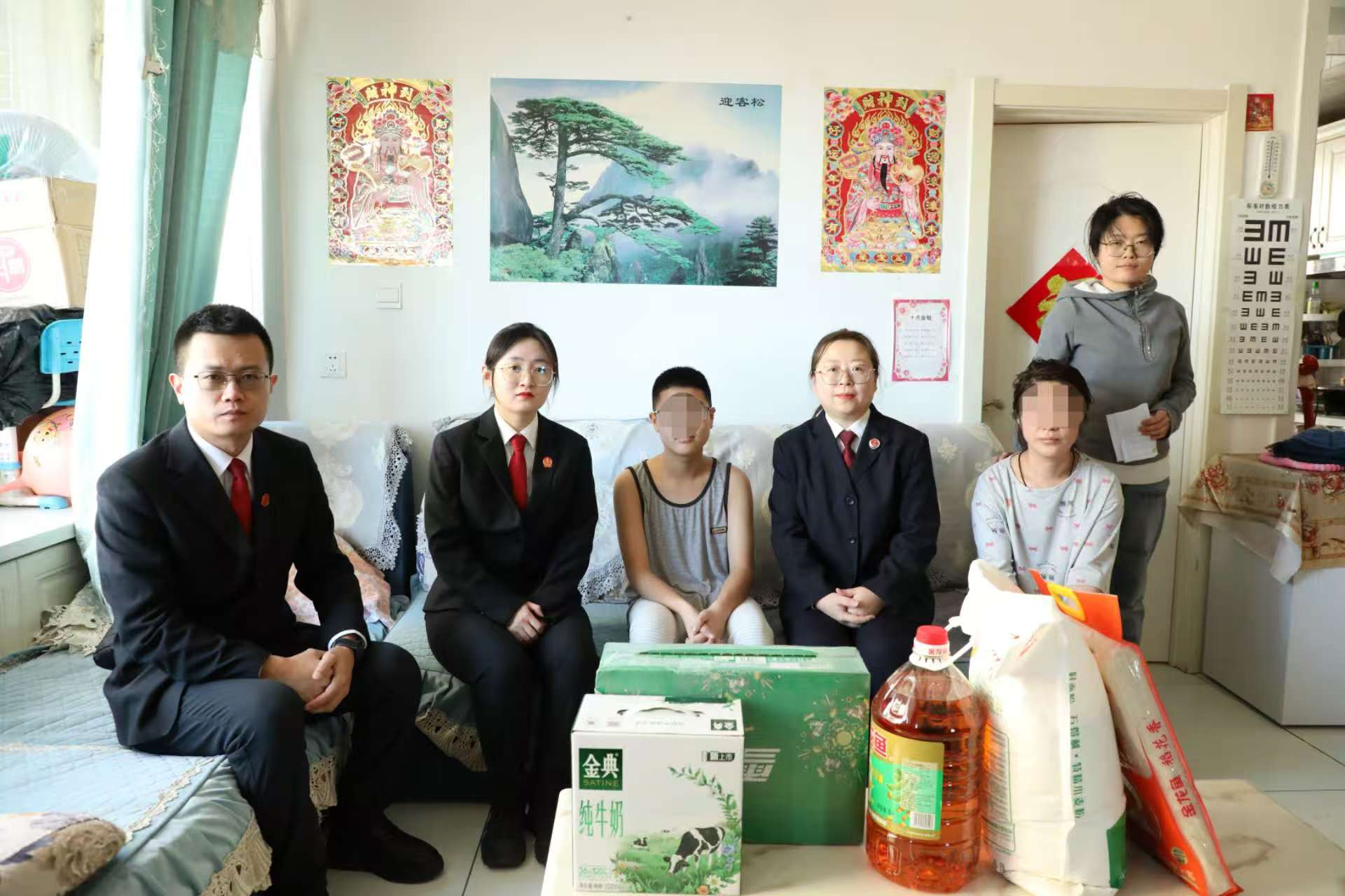 在东升社区困难儿童家中,法院干警详细询问了孩子的学习情况、家庭面临的现实困难。了解到该儿童成年哥哥因病无劳动能力且长年需要照顾,父母无固定工作,家庭主要依靠低保维持生计后,干警送上了精心准备的大米、面粉、食用油、牛奶等生活必需品,并叮嘱孩子要“坚强乐观,用知识改变命运”。
